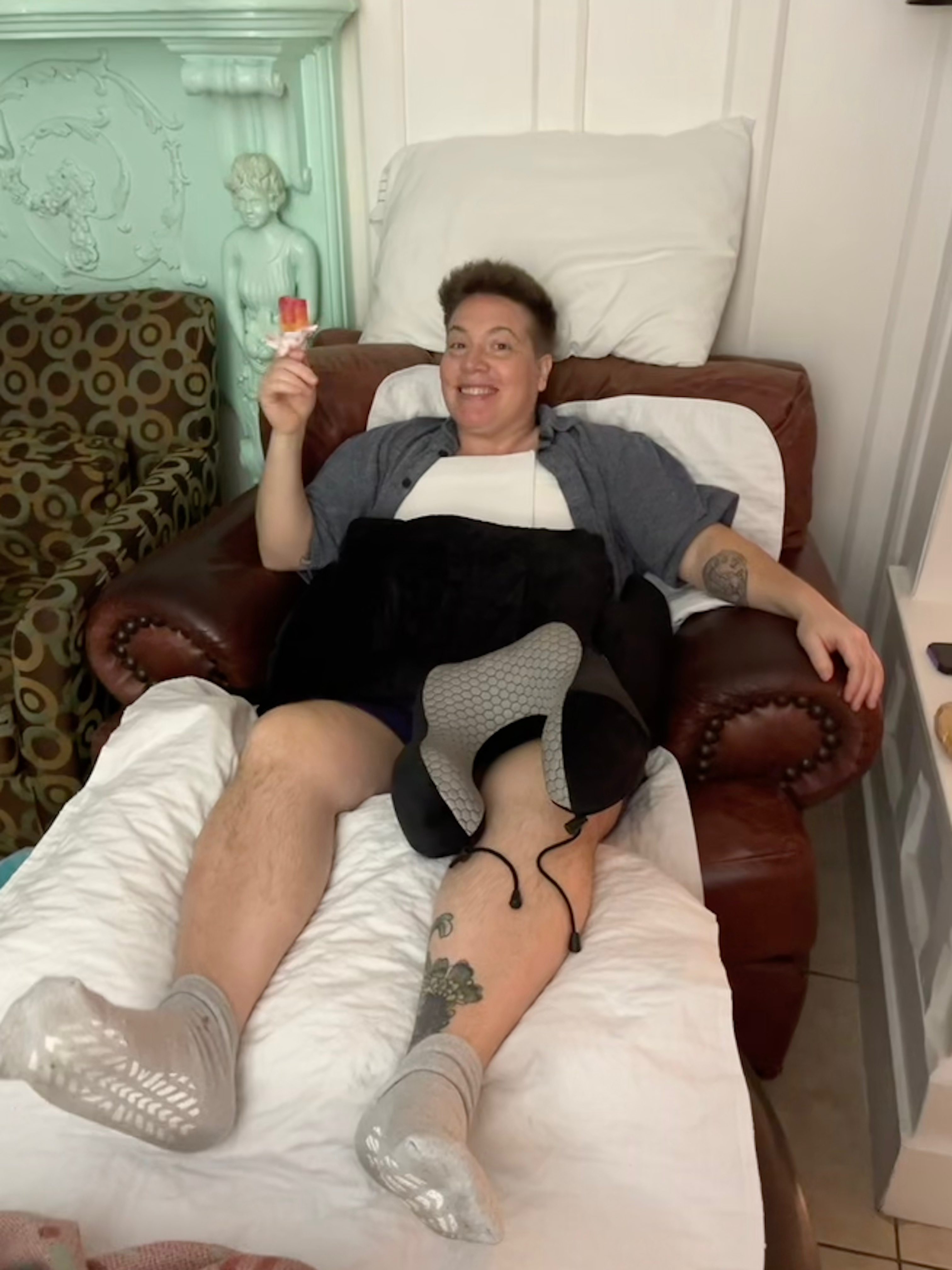 As of today, I am 12 days post gender affirmation surgery! On March 19th, I underwent a drain-free double incision mastectomy with nipple grafting and torso masculinization with liposuction – two major surgeries at once. The morning of, I woke up with zero sense of anxiety, worry, or stress. My surgical time wasn’t scheduled until 12:30pm, so I had many hours to fill beforehand. I found myself pacing around, propelled by excitement and anticipation. I knew my parents would be worried, so I FaceTimed them. Their immediate response upon seeing me on video was to point out how happy and smiley I looked! They could feel my kinetic energy right through the phone screen, and I could feel how my sense of calmness was helping their worries to subside a bit.